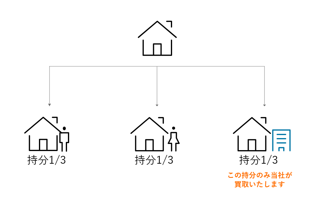夫婦共有名義で不動産購入を所有している場合、離婚する際にどちらかの持分だけ買取をして、そのまま共有者が居住することも可能です。複数人で相続したが、自分の持分だけを買取ってほしい。相続人がおらず、生前に不動産の一部を現金して、生活費に充てたいなど、様々なご事情で持分のみを売却される場合に当社に是非一度ご相談ください。